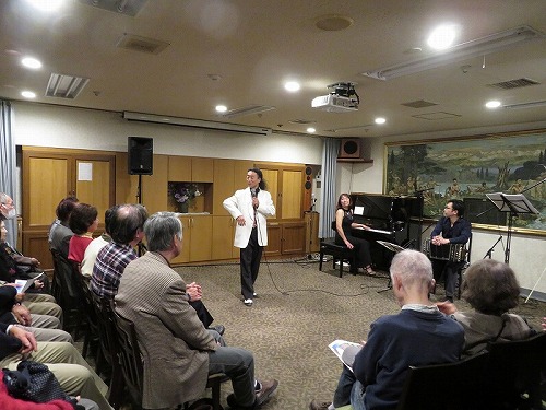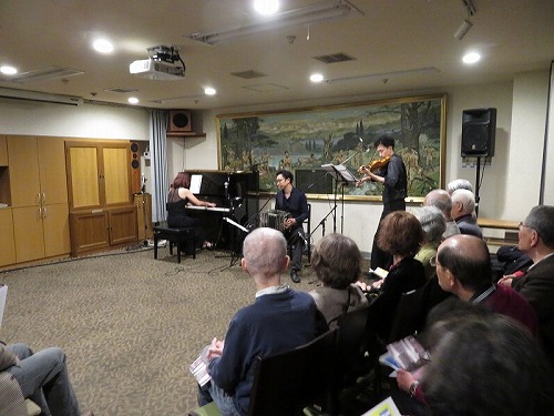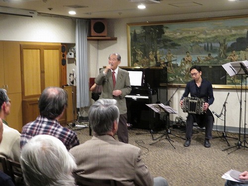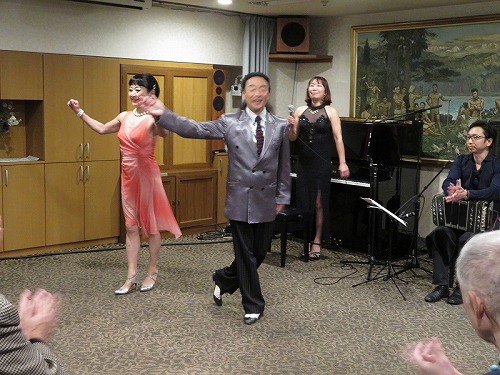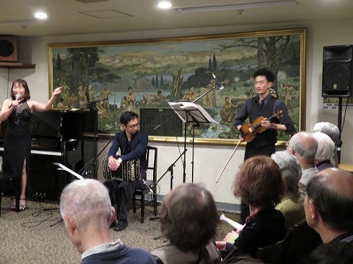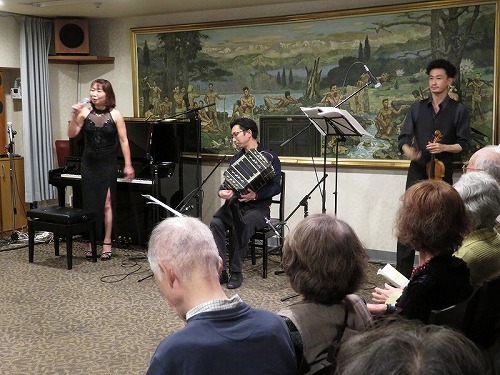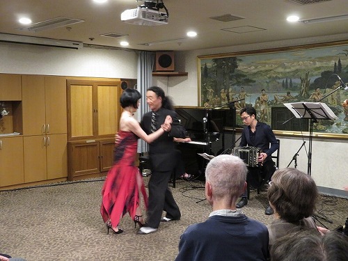 | 栄寿会関東支部音楽鑑賞同好会は、2019年1月30日、日本セカンドライフ協会(JASS)主催の「情熱のアルゼンチンタンゴを間近で」に参加しました。 会場は東京丸の内帝劇ビル地下2階の東京六甲くらぶ(神戸大学OB会施設)。参加者は全体で100名ほど。栄寿会からは3名でした。 出演は、ミユキタンゴ(ピアノ 佐藤美由紀さん、バンドネオン 早川純さん、バイオリン 山中裕平、ダンス ケンジ&リリアン)でした。 時間は午後2時から、本イベントの幹事 津山さんの司会進行でスタート。1時間ほどで休憩(おつまみ付きのビール、ワインでの歓談)、 その後、1時間ほどで終了しました。久々のパンチある演奏とダンスで十分堪能できました。 |